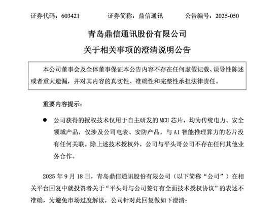 对此,上交所高度关注,并督促公司予以澄清。鼎信通讯19日午间发布澄清说明公告,承认其在相关平台回复中就投资者关于“平头哥与公司签订有全面技术授权协议”的表述不准确。