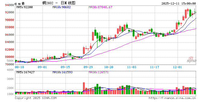 12月11日铜期货市场动态:今日沪期铜早盘高开劲涨,午后涨势减速;主力月2601合约开盘价报92250元/吨,最高93000元/吨,最低91450元/吨,昨结91480元/吨,今日收盘价报92210元/吨,涨730元,涨幅0.80%。沪铜主力2601合约全天成交量138577手减少7216手,持仓量190379手减少9995手。亚盘时段,伦铜高开猛涨后涨幅收窄,北京时间14:52最新报价11628美元/吨,涨68美元/吨,涨幅0.59%。