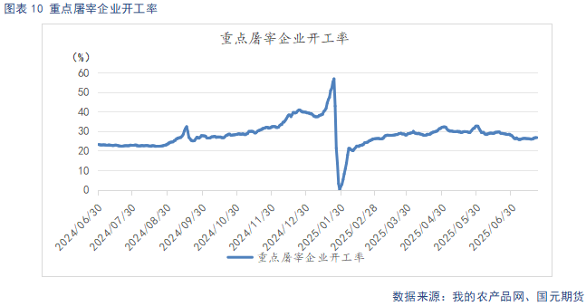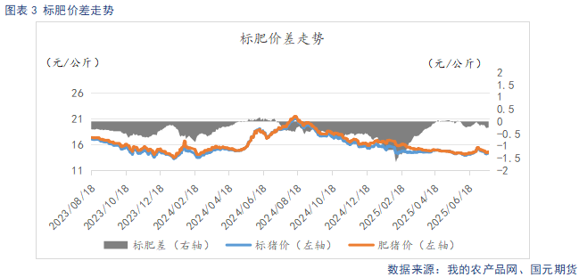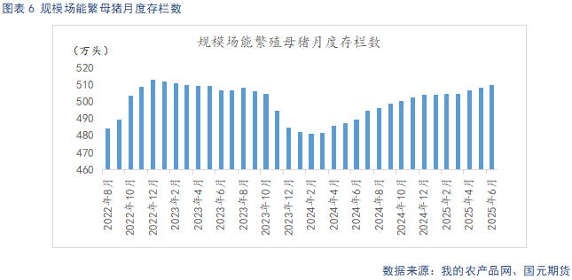 据Mysteel统计,截至2025年6月底,样本规模场能繁母猪存栏量为509.82万头,环比上调0.29%,同比增长4.2%。养殖有一定利润空间,尤其是6月下旬猪价迎来低位反弹,养殖利润走扩,去产能意愿不强,加之对市场存看涨预期,能繁母猪存栏延续增长趋势,从生产周期推算,2025年规模场理论产能呈现环比上升态势。样本规模场6月商品猪存栏数为3574.72万头,环比增加0.3%,同比增加5.63%。样本规模场6月商品猪出栏量为1076.82万头,环比增加1.6%,同比增加23.6%。6月,气温逐步升高,大猪出栏节奏加快。随着大猪存栏下降,7月初养殖端压栏、二育情绪升温,截留部分标猪猪源,出栏节奏放缓,支撑猪价走强。猪价上行后,养殖端认卖心态渐强,出栏节奏有所恢复。近期随着猪价再度走弱,缩量挺价情绪渐起,供给有所缩量。