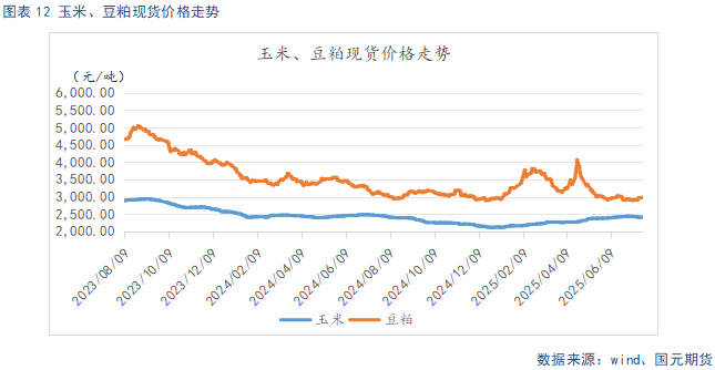 截至7月22日,玉米现货均价2409.9元/吨,较上周环比下跌3.73元/吨,豆粕现货均价2993.14元/吨,较上周环比上涨78元/吨。上周,玉米小幅下跌,豆粕小幅上行。玉米从短期来看,进口玉米持续拍卖增加市场供应,但库存成本与需求韧性形成底部支撑。中期,进口谷物到港量缩减叠加饲用替代品使用比例下降,国内供需有望改善,现货价格预计维持偏强运行。豆粕从基本面看,随着进口大豆到港节奏加快,油厂原料供应紧张局面得到有效缓解,大豆压榨量呈现稳步回升态势。下游采购则维持谨慎态度,导致7月后豆粕库存或进入快速积累阶段。在供应增加而需求平稳的背景下,预计豆粕现货价格承压运行。