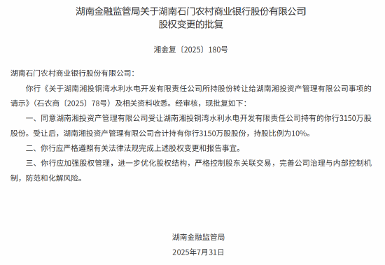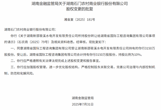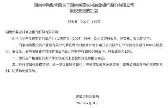 正文 湖南三家农商行股权变更 当地国企获批入股 安信科技 V管理员 /08-06/54阅读/0评论 0806 此篇文章发布距今已超过121天,您需要注意文章的内容或图片是否可用! 8月6日金融一线消息,据湖南金融监管局发布批复显示,该局已批复同意冷水江农商行、新晃农商行、石门农商行的4笔股权变更。其中,湖南湘投资产管理有限公司获批受让新晃农商行、石门农商行各10%股权,湖南省国际工程咨询集团有限公司获批受让冷水江农商行、石门农商行各10%股权,两家公司均系当地国企。