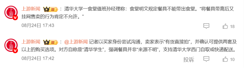对此,清华大学一食堂值班证实,二手平台所售餐具确为清华大学食堂使用的正规餐具。食堂明文规定餐具不能带出食堂,“将餐具带离后又挂网售卖的行为肯定不允许。”食堂已将该情况反馈至上级领导及保卫处,后续将跟进处理。