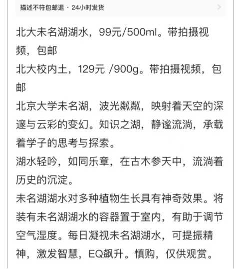 除了清华大学的碗,此前还有个别商家售卖北京大学未名湖湖水,每500毫升标价20元~99元不等。商家称“带拍摄视频,包邮”,并且在商品描述中称“将水摆放在房间内可以提神醒脑、增益脑力、IQ爆表”等。同时多名商家在介绍中称自己是北大的,其中一商家同时在售卖未名湖的土,并称可以找多名北大教授签名。