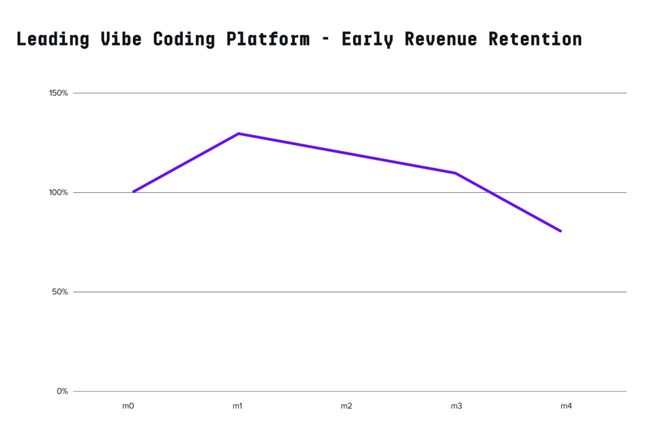 用户留存数据显示这一趋势并非昙花一现。Consumer Edge信用卡面板数据显示,某头部"氛围编程"平台的美国用户群体在注册后数月内收入留存率超过100%,表明用户不仅留存还在扩大使用规模。