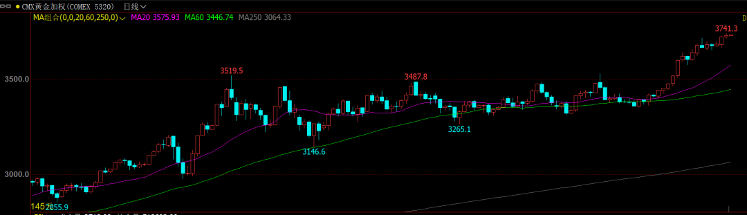 COMEX黄金期货涨0.31%,报3730.50美元/盎司,盘中涨至3739.90美元/盎司,创历史新高。COMEX白银期货跌0.13%,报42.905美元/盎司。